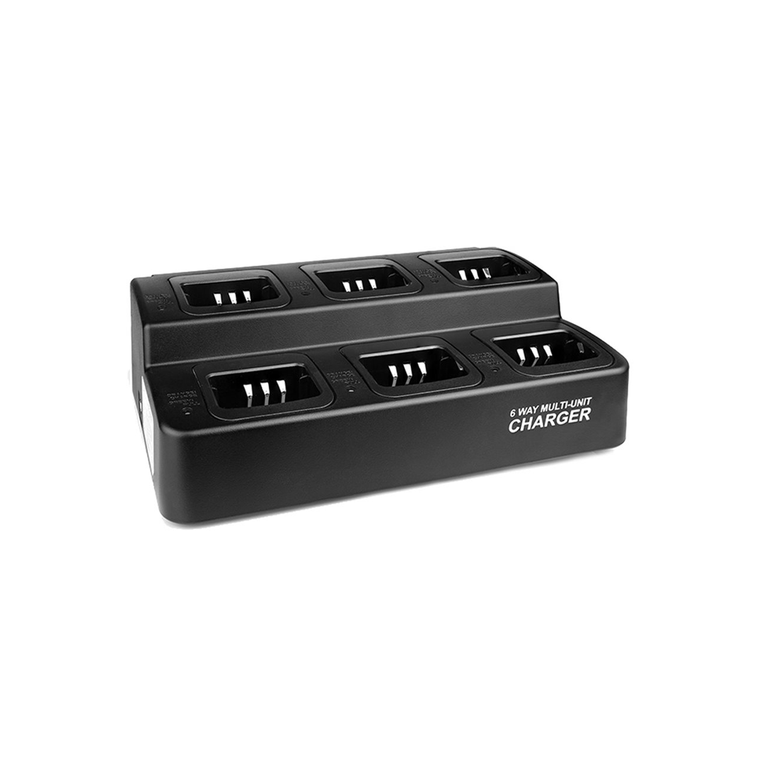 The AXMUDP1EU is a 6-way charger designed for Motorola DP1400 and R2 Series two-way radios. With six charging slots, it allows multiple radios to be charged at once, keeping devices organised and ready for use.